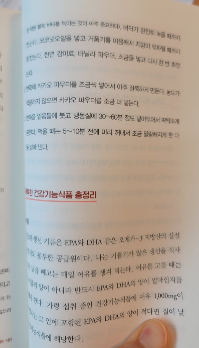 보태기 말... 책에서는 모든 식물성 기름을 엑스트라 버진 올리브오일로 섭취하라고 한다. 우리가 조심해야 할 불길한 기름은 카놀라유, 옥수수유, 대두유, 식물성 유지, 낙화생유, 홍화유, 해바라기씨유, 유채씨유, 포도씨유, 미강유라고 설명한다. 왜냐? 병에 담겨서 판매되는 식용유 속에도 소량의 트랜스 지방이 잠복해있다고 한다.